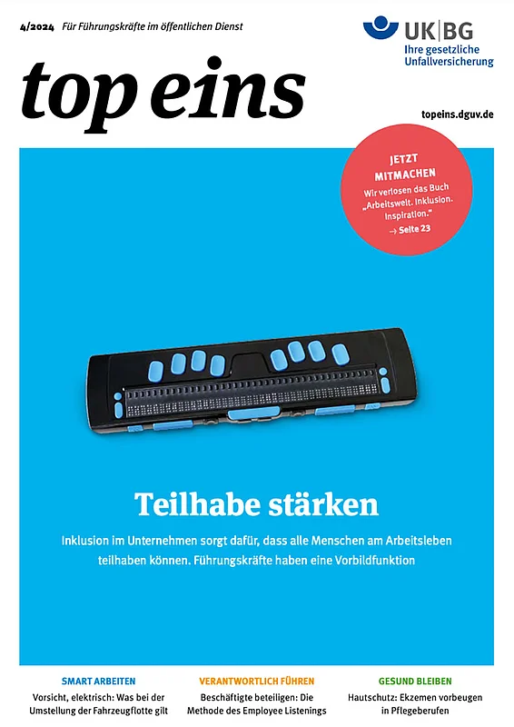 top eins greift praxisnah und branchenübergreifend Themen auf, die Führungskräfte bei gesunder und sicherer Führung unterstützen. Das Ziel: die nachhaltige Etablierung einer Präventionskultur in allen Unternehmen und Einrichtungen.