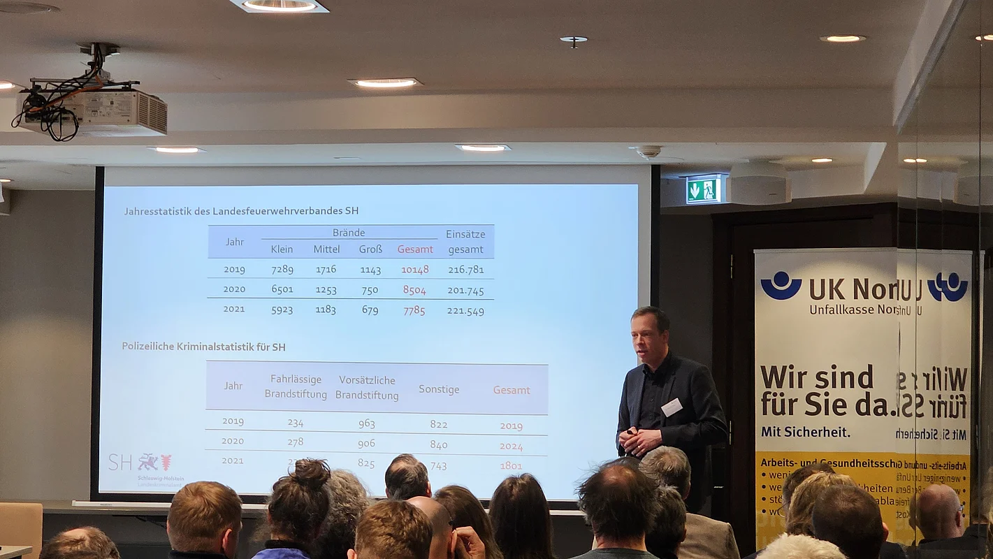 Über Brandschutz referierte Dr. Hendrik Jung, Sachverständiger für Brand- und Explosionsursachen im Landeskriminalamt Schleswig-Holstein. Rund 7800 Brände zählte die Jahresstatistik des Landesfeuerwehrverbands Schleswig-Holstein im Jahr 2021, so Jung. Laut Brandursachenstatistik* stellten Schäden an der Elektrizität mit rund einem Drittel den größten Anteil der Brandursachen, menschliches Fehlverhalten schlugen mit 19 Prozent, Brandstiftung mit 9 Prozent zu Buche.
