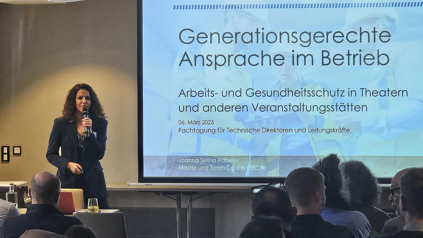 Im demografischen Wandel gewinnt die generationengerechte Ansprache im Betrieb immer stärker an Bedeutung. Dazu referierte Joanna Selina Haberer. Ausgehend von unterschiedlichen Kommunikationsweisen der Generationen stellte die Dozentin Mittel und Methoden vor, um die Beschäftigten bei der Sicherheitskommunikation am Theater generationenübergreifend mitzunehmen. So könnten Arbeitgebende ihre Beschäftigten aus der Babyboomer-Generation gut in Präsenzmeetings „abholen“, die Junior:innen aus der Generation Z (ca. 1997 bis 2009) seien mit kurzen Lernvideos und Gaming-Elementen besser bedient.