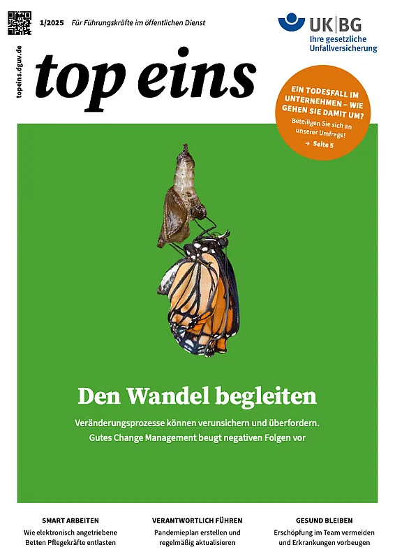 top eins greift praxisnah und branchenübergreifend Themen auf, die Führungskräfte bei gesunder und sicherer Führung unterstützen. Das Ziel: die nachhaltige Etablierung einer Präventionskultur in allen Unternehmen und Einrichtungen.